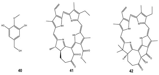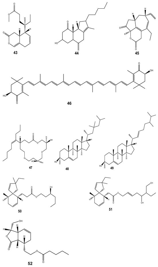 The excessive reactive oxygen species (ROS) (including hydroxyl radical (•OH), superoxide anion (O2•-), hydrogen peroxide (H2O2), nitroxide radicals (NO•), and peroxyl radicals (ROO-)) results in oxidative stress which can cause the pathogenesis of various chronic diseases such as atherosclerosis, diabetes, cancer, arthritis, and the ageing process [166]. In the past few years, mollusc-derived antioxidants (including taurine, carotenoids, α-tocopherol and n-3 polyunsaturated fatty acids, polysaccharides, and peptides), especially those from bivalve and gastropod groups of molluscs, were discovered [83]. The biological pathways of these natural antioxidants are either unknown or not well understood; however, n-3 polyunsaturated fatty acids used as a dietary supplement have been known to mitigate oxidative stress through the induction of cellular antioxidant responses [83]. These compounds could alleviate oxidative stress-mediated diseases by scavenging free radicals. This, in turn, relieves the cellular damage caused by oxidation, and they have been added to health supplements, food additives, and pharmaceuticals [167]. On the other hand, polyphenols are well-known, strong antioxidants due to their common mechanism of donating hydrogen atoms or electrons to neutralize free radicals the effect could be explained by three distinct mechanisms, including scavenging the ROS, regulating the antioxidant system, or oxidative stress-mediated signaling pathways [166]. Some compounds exhibiting antioxidant properties include 3,5-dihydroxy-4-methoxybenzyl alcohol (40) isolated from Crassostrea gigas [83], and Chlorophyllonic acid A methyl ester (41) and Chlorophyllone A (42) from Ruditapes philippinarum [20]. Chromenyl derivative methyl 9-(tetrahydro-3-oxo-3H-isochromen-5-yl) hexanoate (43) obtained from the spineless cuttlefish Sepiella inermis also exhibited this activity as well as Ramosane (44) from Chicoreus ramosus, Octahydroazulenopyrandione (45) from Amphioctopus marginatus, and Astaxanthin (46) from Octopus and cuttlefish species [20]. We also noted that polyether macrocyclic lactone (47) isolated from Babylonia spirata [168], 23-gem-dimethylcholestaenol and methyldihomocholest-5, 22-dienol (48, 49) from Paphia malabarica [169], and O-spirocyclic ether derivatives and irregular meroterpenoid derivatives (50, 51, 52) from Villorita cyprinoides have been reported for their activities [170] (Figure 6).