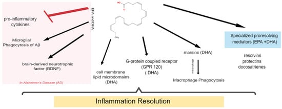 Moreover, researchers have discovered that DHA can reduce inflammation by stimulating the G-protein-coupled receptor (GPR 120), which is a cell membrane receptor specific to DHA []. Additionally, promoting inflammation resolution may involve the alteration of cell membrane lipid microdomains, which play a crucial role in inflammation-related cell signaling pathways []. DHA can reduce the activity of Toll-like receptor 4 (TLR4), a pro-inflammatory molecule, thus contributing to the resolution of inflammation []. Furthermore, omega-3 fatty acids have down-regulatory effects on pro-inflammatory cytokines and stimulate the production of neuroprotective brain-derived neurotrophic factor (BDNF), offering a promising avenue for AD treatment []. Figure 2 summarizes the proposed mechanisms of action of omega-3 molecules (DHA and EPA) in resolving inflammation.