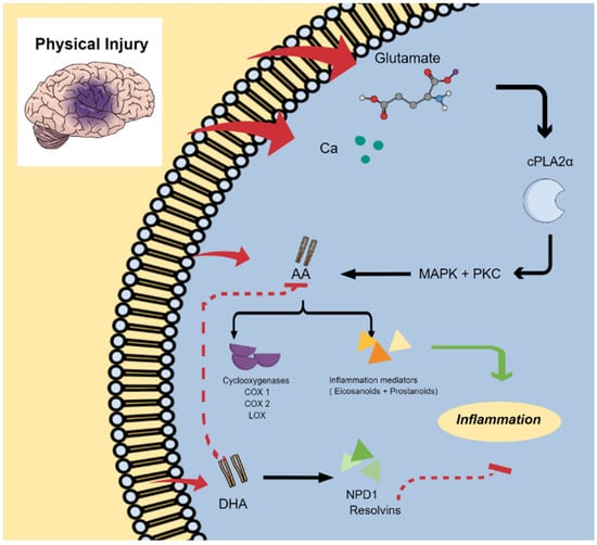 In cases of inflammation related to trauma, such as stroke, traumatic brain injury (TBI), or spinal cord injury (SCI), the balance of free fatty acids becomes disrupted, leading to their accumulation in the cerebrospinal fluid (CSF). In the context of TBI and SCI, the pathophysiology of these conditions begins with the disruption of the blood–brain barrier (BBB) due to physical damage to the skull. This disruption further compromises essential functions, resulting in a state of reduced oxygenation and ultimately leading to apoptosis or cell death [,,]. The dead cells trigger excitotoxicity in the surrounding undamaged cells, caused by the influx and excessive release of glutamate, a major excitatory neurotransmitter, into the healthy cells [,]. This, in turn, activates calcium-dependent lipases, including cytosolic phospholipase A2 (cPLA2), due to the increased influx of Ca2+ through glutamate receptors and voltage-gated Ca2+ channels [,]. Consequently, the deacylation–reacylation reactions are disrupted due to the overactivation of phospholipase A2 (PLA2) and low levels of ATP [,]. This disruption leads to a significant release of free fatty acids, including arachidonic acid (AA) and DHA, from the cell membranes.