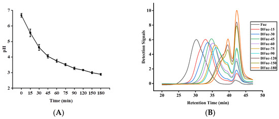 The pH values of fucoidan degraded by UV/H2O2 after different treatment times are shown in Figure 1A. As the treatment time prolonged, the pH values continuously decreased. It decreased from 6.69 ± 0.12 to 2.89 ± 0.06 after degradation for 180 min. The decrease in pH values was mainly attributed to the electron-withdrawing of free radicals to produce H+, as well as the production of acidic substances in fucoidan solutions. Therefore, the change in pH values could reflect the degradation effect of fucoidan [12]. In this study, the pH values decreased rapidly from 6.69 ± 0.12 to 3.16 ± 0.02 at 0–120 min, indicating the severe degradation of fucoidan. At 120–180 min, the pH values tended to stabilize, indicating that the content of hydroxyl radicals (·OH) decreased and most of the main sites attacked by free radicals in polysaccharides had been broken after degradation for 120 min [13]. The above results were consistent with those of the study by Yang et al. [14].