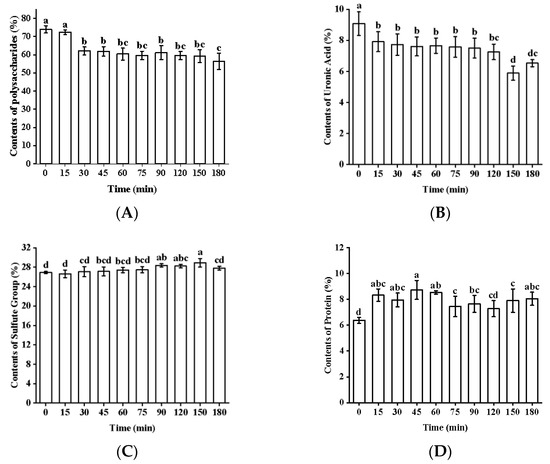 The chemical compositions of the degraded fucoidans are shown in Table 2 and Figure 2. With the prolongation of treatment time, the total sugar and uronic acid contents of fucoidans decreased by 23.7% and 28.0%, respectively, while the sulfate group contents of sugars increased by 6.6%. The protein content did not change significantly. The OH free radical attacked the H atom of the polysaccharide C bond, forming a carbon center free radical of the polyethylene group. The free radicals attacked polysaccharides, ultimately leading to glycosidic bond cleavage and chemical composition changes [20,21]. The decrease in the content of uronic acid was due to the decarboxylation of polysaccharides under intense degradation conditions [22]. Connection sites between sulfate groups and polysaccharides were less susceptible to free radical attacks, but the decrease in total sugar content led to a relative increase in the contents of sulfate groups [13]. The sulfate group contents of polysaccharides were a key factor in their biological activities [23]. Liu et al. also found that fucoidan with higher sulfate group contents showed stronger antibacterial activity [18]. Therefore, the increase in the sulfate group contents of the degraded fucoidans might have contributed to their enhanced antibacterial activity.