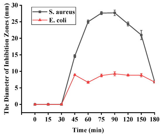 The antibacterial activities of degraded fucoidans were studied. As shown in Figure 4, DFuc-90 showed the maximum inhibitory zones against S. aureus and E. coli, which were 27.70 ± 0.84 mm and 9.25 ± 0.61 mm, respectively (Supplementary Figure S1A,B). The antibacterial activity of degraded fucoidan increased up to 90 min but then decreased with further degradation. This might be because the molecular weight of fucoidan was decreased and -CO, -OH, -COO, and -CH were exposed, which had good chelating ability towards metal ions, thereby affecting or inhibiting bacterial absorption of nutrients and metal ions [31]. After 90 min, the antibacterial activity of degraded fucoidan decreased. It was speculated that the spatial conformations of fucoidan were broken after a long time of degradation, which might decrease its antibacterial activity. This indicated that fucoidan might require a certain degree of polymerization and molecular weight to show antibacterial activity. Meanwhile, Liu et al. concluded that fucoidan with low molecular weight (5–50 kDa) and high sulfate group content (over 20%) had stronger biological activity [18]. Similarly, the degraded fucoidan with molecular weight 20–35 kDa and sulfate group content (over 27%) showed good antibacterial activities in our study. These DFucs expressed good antibacterial activities against both S. aureus and E. coli. Among the samples, DFuc-90 showed the strongest antibacterial activity.