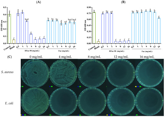 The MIC of DFuc-90 against S. aureus (A) and E. coli (B), and the MBC of DFuc-90 against S. aureus and E. coli (C). Different lowercase letters mean significantly different (p < 0.05).