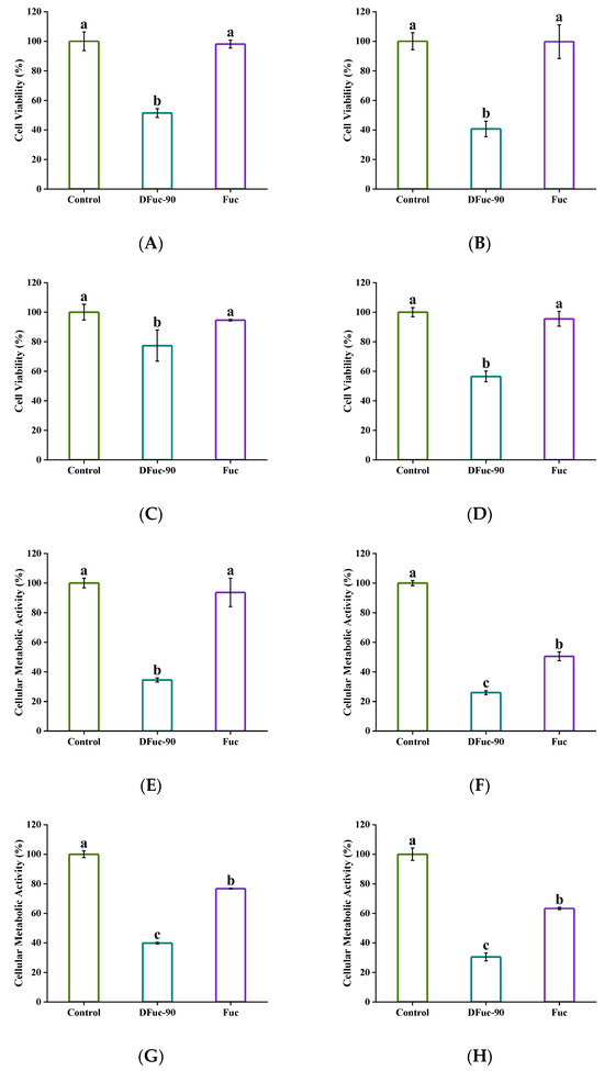 Effect of 2 × MIC of DFuc-90 on the bacterial cell viabilities and metabolic activities after incubation for 3 and 24 h, respectively. (A) Cell viability of S. aureus after 3 h; (B) cell viability of S. aureus after 24 h; (C) cell viability of E. coli after 3 h; (D) cell viability of E. coli after 24 h; (E) metabolic activity of S. aureus after 3 h; (F) metabolic activity of S. aureus after 24 h; (G) metabolic activity of E. coli after 3 h; (H) metabolic activity of E. coli after 24 h. Different lowercase letters mean significantly different (p < 0.05).