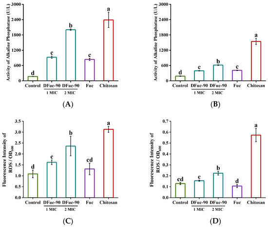 Reactive oxygen species (ROS) was a class of oxygen-containing active molecules, including hydrogen peroxide, superoxide, pure oxygen, and hydroxyl radicals. Abnormal levels of ROS led to lipid oxidation, protein oxidation, DNA strand breakage, and base modification errors, which were generally recognized as the cause of significant cell damage [40]. As shown in Figure 8C,D, there was a significant difference in ROS contents between the 2 × MIC DFuc-90 treatment group and the control group (p < 0.05), indicating that the treatment of DFuc-90 would lead to the accumulation of intracellular ROS in bacteria. The accumulation of ROS could cause changes in the redox balance in cells and lead to a series of cellular dysfunctions, which could explain the antibacterial activity of DFuc-90. The same phenomenon existed in the study by Zhang et al., which showed that mycelium polysaccharide increased the intracellular ROS content of E. coli [36].
