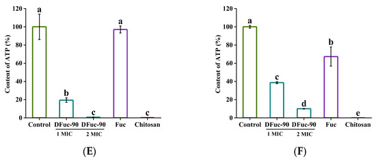 Effect of DFuc-90 on the bacterial AKP activity, ROS, and ATP. (A) AKP activity of S. aureus; (B) AKP activity of E. coli; (C) ROS content of S. aureus; (D) ROS content of E. coli; (E) ATP content of S. aureus after 3 h; (F) ATP content of E. coli. Different lowercase letters indicated significant differences (p < 0.05).