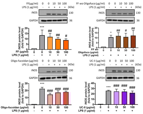 Raw264.7 cells were kindly provided by Professor Yong-Han Hong (National Taiwan Normal University, Taipei, Taiwan). These were cultured in DMEM(HG) (Gibco, Life Technologies, Carlsbad, CA, USA) supplemented with 10% fetal bovine serum (FBS) (Corning, New York, NY, USA) and a 1% Antibiotic-Antimycotic (Corning) solution in a 5% CO2, 37 °C incubator. The aim was to evaluate the formula and the related components’ ability in suppressing iNOS expression. The FF, FF without oligo-fucoidan, oligo-fucoidan, and UC-II supplied from Hi-Q were co-treated with 1 μg/mL of lipopolysaccharides from Escherichia coli O111:B4 (Sigma Aldrich, St. Louis, MO, USA), based on a previous study [].