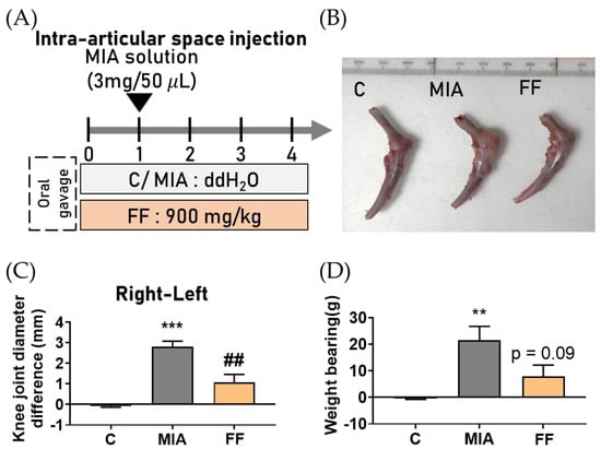 The effects of oligo-fucoidan-based formula intervention on the symptoms of OA. (A) Flow chart of the procedure. (B) Knee appearance after treatment. (C) Knee diameter difference. (D) Weight bearing ability. The experimental groups were the following: C, control group; MIA, MIA-induced group; FF, oligo-fucoidan-based formula (FF) 900 mg/kg + MIA-induced group. Statistical significance is denoted as ** p < 0.01; *** p < 0.001 compared with the control group, and ## p < 0.01 compared with the MIA-induced group.