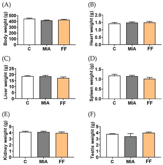 The toxicity evaluation of oligo-fucoidan-based formula intervention. The examination of body weight (A), heart (B), liver (C), spleen (D), kidney (E), and testis weight (F) showed no significant differences after the intervention. The experimental groups were the following: C, control group; MIA, MIA-induced group; FF, oligo-fucoidan-based formula (FF) 900 mg/kg + MIA-induced group.