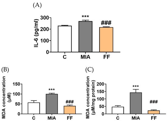 Cytokine secretion and oxidative stress evaluation. (A) IL-6 levels were evaluated after the intervention. (B) The serum MDA concentration and (C) tissue MDA concentration were evaluated by the TBARS assay. The experimental groups were the following: C, control group; MIA, MIA-induced group; FF, oligo-fucoidan-based formula (FF) 900 mg/kg + MIA-induced group. Statistical significance is denoted as *** indicating p < 0.001 compared with the control group, and ### indicating p < 0.001 compared with the MIA-induced group.