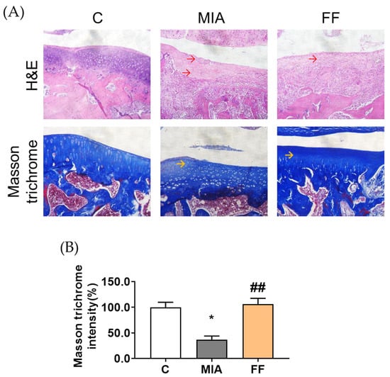 Histological appearance of the articular cartilage after the intervention. (A) Histological image after staining with H&E and Masson trichrome. (B) Quantification of the Masson trichrome intensity. The experimental groups were the following: C, control group; MIA, MIA-induced group; FF, oligo-fucoidan-based formula (FF) 900 mg/kg + MIA-induced group. Red arrow: articular cartilage showing some irregularities on the surface. Yellow arrow: extracellular matrix leakage. Statistical significance is denoted as * indicating p < 0.05 compared with the control group, and ##, indicating p < 0.01 compared with the MIA-induced group.