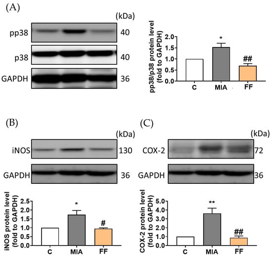 Related pathway modulation in oligo-fucoidan-based formula modulation. (A) pp38/p38, (B) iNOS, and (C) COX-2 protein expression was examined by Western blotting. The experimental groups were the following: C, control group; MIA, MIA-induced group; FF, oligo-fucoidan-based formula (FF) 900 mg/kg + MIA-induced group. Statistical significance is denoted as * p <0.05; ** p < 0.01 compared with the control group, and # p < 0.05; ## p <0.01 compared with the MIA-induced group.