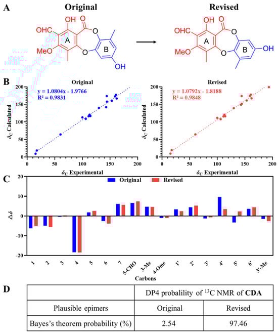 Revision of the molecular structure of curdepsidone A (CDA). (A) The molecular structure of curdepsidone A. (B) The plot of linear correlation between the calculated and actual values for the 13C of curdepsidone A. (C) Relative error analysis performed to assess the deviation between the calculated and actual 13C values. (D) DP4 probability analysis was employed to evaluate the confidence level associated with the assignment of 13C values for curdepsidone A.