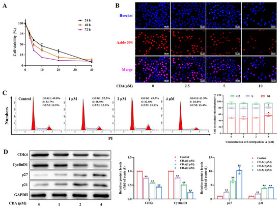 Curdepsidone A inhibited cell viability and induced G0/G1 phase arrest in HeLa cells. (A) HeLa cells were exposed to curdepsidone A at various concentrations for 24, 48, or 72 h. The cytotoxic activity of curdepsidone A in HeLa cell lines was measured. (B) HeLa cells were exposed to curdepsidone A for 24 h and stained with Hoechst 33342. DNA synthesis in HeLa cells was detected using an EdU assay. (C) HeLa cells were exposed to curdepsidone A for 24 h. The cell cycle in HeLa cells was analyzed. (D) The effects of curdepsidone A on the expression of the cell-cycle-related proteins CDK4, Cyclin D1, p27, and p21 at concentrations of 0, 1, 2, and 4 μM were examined. Values are mean ± SD, n = 3, * p < 0.05. ** p < 0.01.