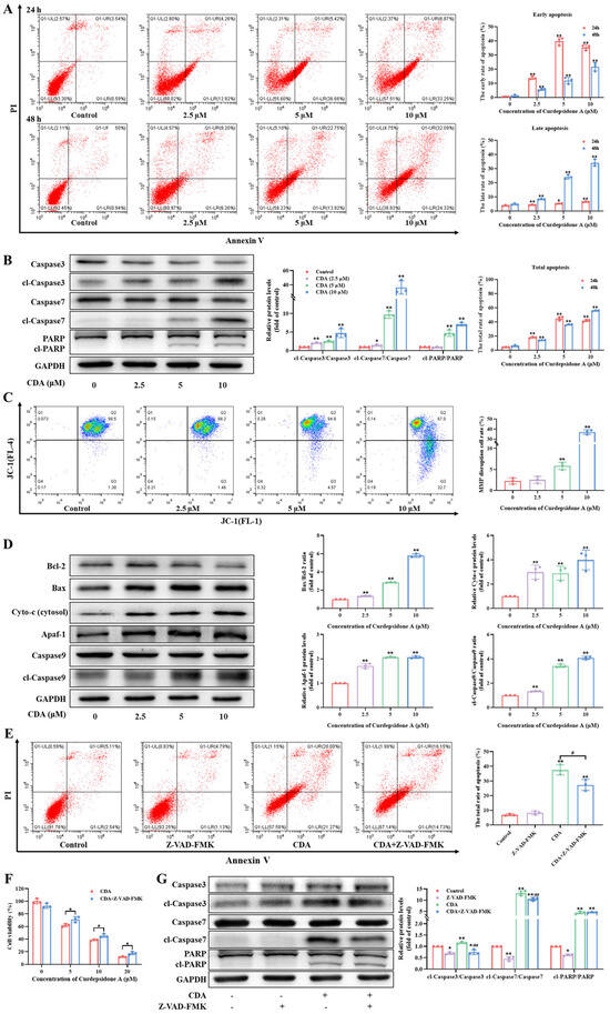Curdepsidone A induced apoptosis of HeLa cells. (A) HeLa cells were exposed to curdepsidone A for 24 or 48 h. The effect of curdepsidone A on the apoptosis of HeLa cells was measured. (B) The effects of curdepsidone A on the expression of the apoptosis-related proteins caspase3, cl-caspase3, caspase7, cl-caspase7, PARP, and cl-PARP were examined. (C) Mitochondrial membrane potential (MMP) in HeLa cells treated with curdepsidone A for 48 h was analyzed. (D) The effects of curdepsidone A on the expression of the endogenous apoptosis-related proteins Bax, Bcl-2, Cyto-C (cytosol), Apaf-1, caspase9, and cl-caspase9 were examined. (E–G) HeLa cells were pretreated with Z-VAD-FMK (20 μM) for 2 h and then treated with curdepsidone A (10 μM) for 48 h. The apoptosis of HeLa cells (E), the cell viability (F), and the expression of caspase3, cl-caspase3, caspase7, cl-caspase7, PARP, and cl-PARP (G) were examined. Values are mean ± SD, n = 3, * p < 0.05, ** p < 0.01 versus the control group; # p < 0.05, ## p < 0.01 versus the CDA group.