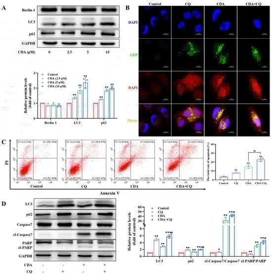 Curdepsidone A inhibited protective autophagy in HeLa cells. (A) HeLa cells were exposed to curdepsidone A for 48 h. The expression of autophagy-related proteins was examined. (B) The autophagy flux was detected using GFP-RFP-LC3B double-labeled adenovirus. (C,D) HeLa cells were treated with curdepsidone A (10 μM) alone or in combination with CQ (10 μM) for 48 h. The apoptosis of HeLa cells (C) and the expression of LC3, p62, caspase7, cl-caspase7, PARP, and cl-PARP (D) were examined. Values are mean ± standard deviation, n = 3, * p < 0.05, ** p < 0.01 versus the control group; # p < 0.05, ## p < 0.01 versus the CDA group.