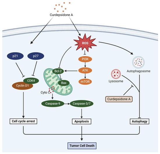 Uncontrolled cell proliferation is one of the characteristics of cancer due to the disruption of the cell cycle [43]. As a result, regulating the cell cycle is becoming one of the most important means of cancer therapy. We observed that curdepsidone A could increase the proportion of G0/G1-phase cells, suggesting that curdepsidone A caused G0/G1-phase cycle arrest in HeLa cells. The activation of cyclin-dependent kinases (CDKs) is closely related to the dysregulation of the cell cycle mechanism [44]. CDK4/6-cyclin D1 complexes promote cell cycle progression and phosphorylate retinoblastoma protein (pRb) in response to growth signals [45]. P21 and p27, endogenous inhibitors of CDK inhibitors (CKIs), are in charge of preventing the cell cycle from progressing by suppressing CDKs [46,47]. In addition, both p21 and p27 are involved in several other pathways of cell metabolism, including DNA replication and repair, transcriptional regulation, and apoptosis [47,48]. We found that curdepsidone A suppressed the level of CDK4 and Cyclin D1 and promoted the level of p21 and p27. These findings showed that curdepsidone A suppressed the growth of HeLa cells by modulating the cell cycle-related proteins and triggering G0/G1-phase cell cycle arrest.