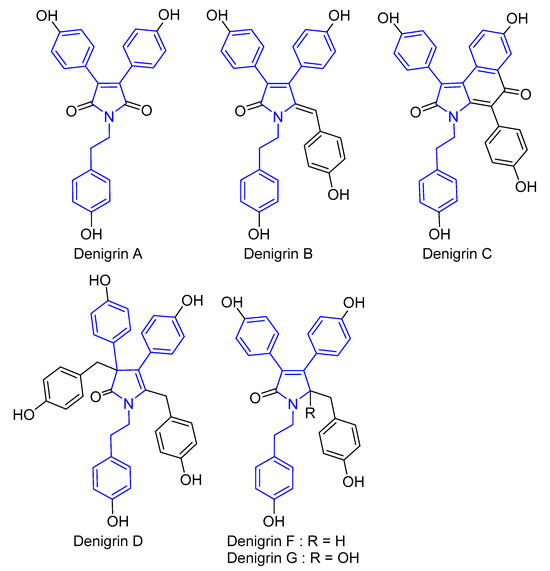 Structures assigned to the previously reported denigrins with the general structure of denigrin type compounds displayed in blue.