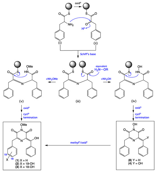 5. A comparable pathway with the opposite C-7 oxidation stereochemical outcome, and with acylation of (iii) with a shorter saturated polyketide, could explain the 7