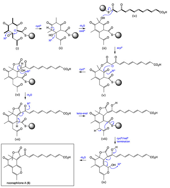 Scheme 2) could proceed via a typical PKS cascade assembly of three acetate and two propionate residues to arrive at the acyclic intermediate (i), with intramolecular cycloaddition to (ii), and dehydration and oxidation to (iii), followed by acylation with a parallel polyketide polyene (iv) to yield the ester (v). The latter is set up to undergo a second intramolecular cycloaddition to yield (vi) with concomitant loss of water to (vii), followed by keto-enol tautomerization to (viii) and cyclization-mediated termination (and reduction) to (ix), with a facile dehydration yielding