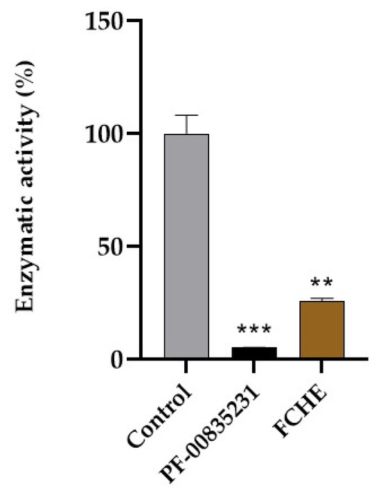 Normalized free 3CLpro enzymatic activity under control conditions (100% enzymatic activity) or in the presence of PF-00835231 at 1 µM or FCHE at 100 μg·mL−1. ** Represents a significant difference (p < 0.01) according to unpaired Student’s t-test (FCHE vs. control). *** Represents a significant difference (p < 0.001) according to unpaired Student’s t-test (PF-00835231 vs. control).