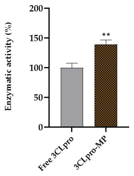 Normalized 3CLpro-MP enzymatic activity in relation to enzymatic activity of free 3CLpro (100%). ** Represents a significant difference (p < 0.01) according to unpaired Student’s t-test (free 3CLpr vs. 3CLpro-MP).