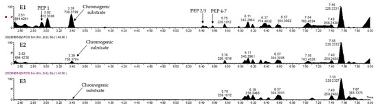 LC-HRMS chromatograms (expressed as a percentage of the highest peak’s intensity) of eluants after elution steps E1, E2 and E3. Mass spectrometry chromatograms obtained in positive polarity from the three eluates E1, E2 and E3.