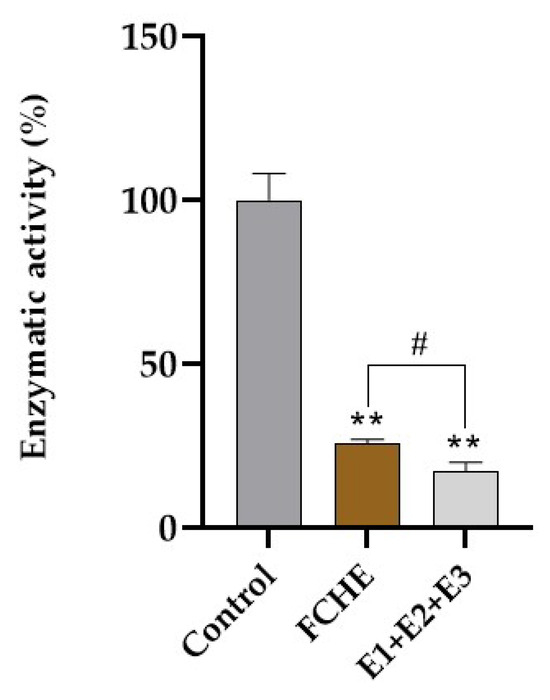 Normalized free 3CLpro enzymatic activity under control conditions (100% enzymatic activity) or in the presence of the FCHE at 100 µg·mL−1 or the ligand-fishing eluate mix E1 + E2 + E3. ** represents a significant difference (p < 0.01) in relation to the control, according to the unpaired Student’s t-test. # Represents a significant difference (p < 0.01) according to the non-paired Student’s t-test (FCHE vs. E1 + E2 + E3).