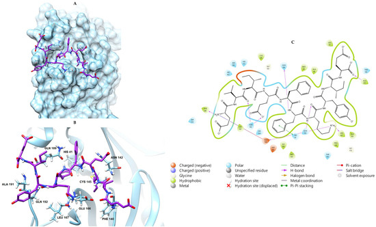 In an initial step, a redocking procedure was performed with the co-crystallographic peptide ligand at the active site of the 3CLpro. In order to achieve the best RMSD, various parameters were tested in the GOLD program, and the best result was obtained using the default with the exception of the ligand flexibility, which was set to 200%. In this configuration, it was possible to obtain an RMSD of 1.889 Å. Molecular docking simulations of the seven peptide sequences fished from the FCHE revealed a better affinity for the 3CLpro than the co-crystallographic ligand, as shown in Table 2. All peptides identified showed a good binding capacity in the 3CLpro’s active site and interactions with neighboring amino acids. Plausible non-covalent interactions within the active site of the protease involved an electrostatic attraction for His 41 and a hydrophobic interaction with Cys 145. Modeling also revealed the possibility of several other polar (hydrogen bonds and electrostatic) and hydrophobic interactions with amino acid residues located outside of the active site (see Figure 5 for PEP4, the peptide showing the best affinity score, and Figures S4–S9 for the other peptides).