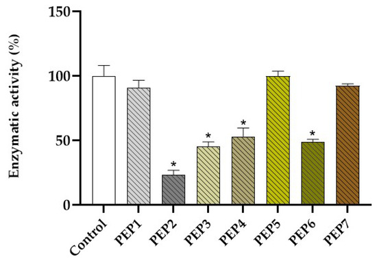 Normalized free 3CLpro enzymatic activity under control conditions (1% DMSO) or in the presence of PEPs 1-7 (10 µM and 1% DMSO). * Represents a significant difference (p < 0.01) in relation to the control according to a one-way ANOVA followed by Dunnett’s multiple-comparison test.