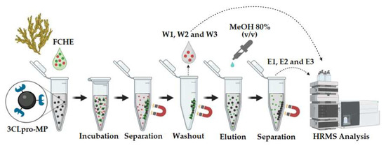 For the ligand-fishing assay, 50 μL of 3CLpro-MPs were mixed with 20 μL of the FCHE and 130 µL of a buffer. The FCHE final concentration was 1 mg·mL−1, and the mix was incubated for 2 h. The DMSO concentration (10%, v/v) was checked to ensure its compatibility with the enzymatic activity [34]. After incubation for 2 h at 20 °C, the beads were recovered with the aid of a magnetic stand, rinsed three times with HEPES buffer to wash out weakly bound ligands (W1, W2, and W3), rinsed two times with Milli-Q water to rinse away residual buffer, and rinsed three times with methanol 80% v/v to elute strongly bound ligands (E1, E2, and E3). In the end, W1, W2, W3, E1, E2, and E3 were stored at −20 °C for analysis using ultra-high performance liquid chromatography coupled to high-resolution mass spectrometry and ultraviolet spectrometry (UPLC-MS and UPLC-UV). A simplified scheme is provided in Figure 7.