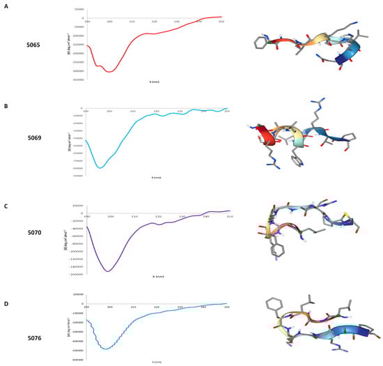Characterization of secondary structure of peptides. Spectra of circular dichroism for peptides (A) 5065; (B) 5069; (C) 5070; and (D) 5076 in 30% v/v trifluoroethanol in water (left). On the right, 3D-structure model of peptides.