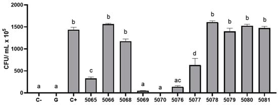 Antibacterial activity of synthetic peptides identified in the mucus of S. lalandi and S. violacea against Escherichia coli. The growth of E. coli is expressed in colony-forming units (CFU/mL) after application of 100 µM of synthetic peptides. As a negative control (C−) culture media without bacterial inoculum was used. Positive control (C+) was growth of E. coli without treatment. Treatment with gentamicin was used as positive antibacterial activity (G). Significant differences with respect to C+ are indicated with a different letter (p > 0.05).