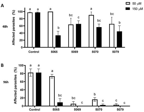 Antiparasitic activity of synthetic peptides against copepodite stage of C. rogercresseyi. Affected parasites was expressed as a percentage. The effect of the peptides at 50 and 150 µM on the copepodite stage was evaluated at (A) 48 h and (B) 96 h. Seawater-only conditions were employed as the control for copepodite survival. Statistically significant differences from the control are indicated by distinct letters (p > 0.05).
