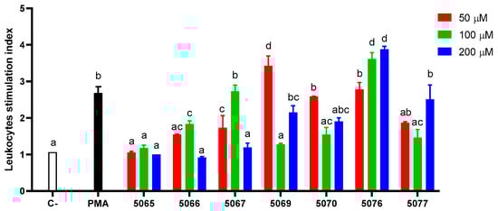 Effect of synthetic peptides on the activation of the respiratory burst process of anterior kidney leukocytes. Respiratory burst stimulation index of leukocytes treated with phosphate buffered saline (C−), Phorbol 12-myristate 13-acetate (PMA), and synthetic peptides (5065–5077) at three different concentrations (50, 100, and 200 µM) at 22 °C. Significant differences are indicated in different letters (p > 0.05).