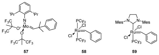 Schrock’s catalyst 57, first-generation Grubbs’ catalyst 58 and second-generation Grubbs’ catalyst 59.
