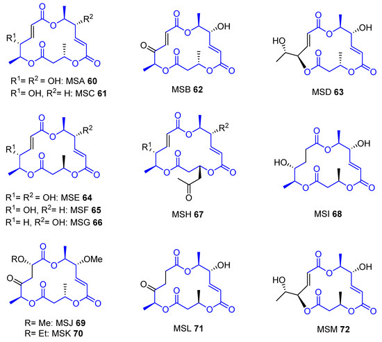 Molecular structures of compounds from the Macrosphelide (MS) family, where the blue color represents the core of these macrolides [72].