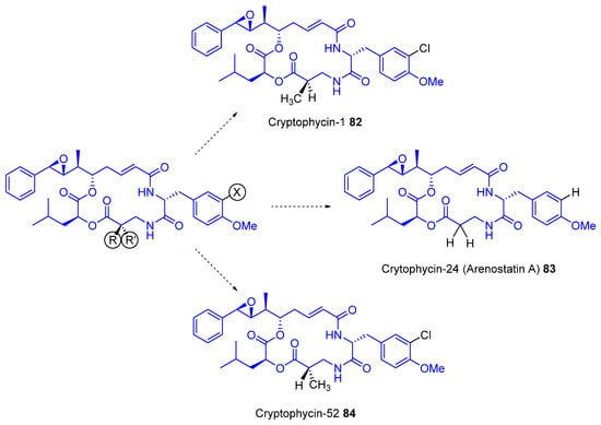 A promising strategy to design new anticancer agents consists of the conjugation of natural marine products with other biologically active agents with a linker. The addition of linkers should not influence the biological performance of the chemotherapeutic payload, should not induce aggregation and limit the premature release of payloads in plasma and effectively release active molecules at targeted action sites. A good example of such is the macrosphelide A-biotin and avrainvillamide–biotin chimeras’ case [71]. It has been designed to identify both the target protein and the mechanism of action used by the macrosphelide family (Figure 2). Macrosphelide A is a natural polyketide with multiple biological properties, such as its anticancer activity against lung metastasis of B16/BL6 melanoma in mice or the inhibition of human leukemia HL-60 cells adhesion to the monolayer of lipopolysaccharide-activated human-umbilical-vein endothelial cells (HUVECs) [72]. It was isolated for the first time from the fermentation broth of Micreosphaeropsis sp. FO-5050 and later from a mycoparasite (Coniothyrium minitans) and a fungus (Tritirachium sp. HKI 0317) [73].