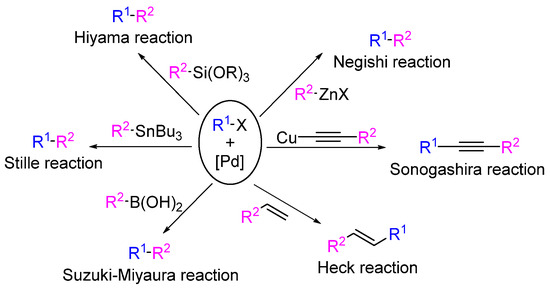 Among Pd-catalyzed cross-coupling reactions, we find the Suzuki–Miyaura, Negishi and Heck reactions, winners of the Nobel Prize in Chemistry in 2010. In the Suzuki–Miyaura reaction [26,27], arylboronic acids and esters are coupled with aryl halides in the presence of a palladium catalyst to give biaryls. On the other hand, the Negishi reaction [28] consists of a Pd-catalyzed coupling of aryl halides with arylzinc reagents. Meanwhile, the Heck reaction [29] is slightly different with respect to the previous two reactions and other cross-coupling reactions as it does not use any organometallic reagent. This transformation involves aryl, alkenyl and benzyl halides that are directly coupled with an alkene in the presence of a palladium catalyst. The reaction runs in the presence of a base, and the product obtained is the corresponding substituted alkene. Other examples of Pd-catalyzed cross-coupling reactions are the Stille [30], Hiyama [31] and Sonogashira [32] reactions (Scheme 2).
