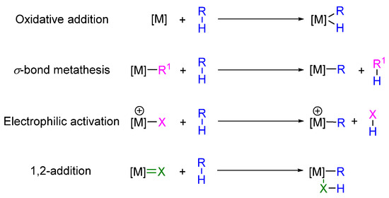 C-H activations’ mechanisms. The R-H bond that is activated is indicated by blue; pink indicates the substituent (R1 or X) of the metal that replaces the R substituent of the R-H bond; green indicates the unsaturated M-X bond, in which the R-H bond is added.