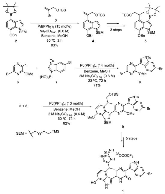 Dragmacidins are bisindole alkaloids isolated for the first time in 1988 from the deep-water marine sponge Dragmacidon sp. [34]. These marine alkaloids are characterized by a bisindole structure, in which a 6-bromoindole is bonded to a piperazine, pyrazinone or pyrazine ring. Currently, 11 derivatives of dragmacidins are known, and many of them have demonstrated good antitumor, antiviral, cytotoxic, antifungal and antimicrobial activities [35]. Among these natural products, Dragmacidin D 1 is a powerful inhibitor of serine–threonine protein phosphatases. It also induces cytotoxicity in the murine leukemia cell line and in the human lung adenocarcinoma cell line [36]. The biological properties of this compound have prompted the development of synthetic routes to Dragmacidin D and precursors. In 2002, Stoltz et al. [37] reported a total synthesis for this alkaloid in which the key reactions were sequential Pd-catalyzed Suzuki–Miyaura cross-coupling reactions (Scheme 4). In the first of them, the indole derivative 2 reacted in the presence of Pd(PPh3)4 with vinyl bromide 3 to give indolylether 4 with a yield of 83%. This indolylether 4 was then transformed into fragment 5 after three synthetic steps. In a parallel way, a Suzuki–Miyaura reaction between dihalopyrazine 6 and indole derivative 7 catalyzed by Pd(PPh3)4 afforded compound 8 in 71% yield. Afterward, a Suzuki–Miyaura cross-coupling reaction using the previously formed fragments 5 and 8, mediated by the palladium catalyst employed before, yielded the bis-indole alkoxypyrazine 9. It should be noted that the desired product 9 was obtained with good yields and selectivity under very controlled conditions and the lowest possible temperature (50 °C), as the reaction required good temperature control. If the temperature reached 80 °C, the coupling reaction of the bromoindole unit would become competitive with the targeted one. Finally, five synthetic additional steps were required to access the target molecule Dragmacidin D 1.