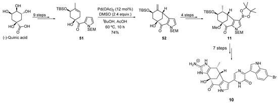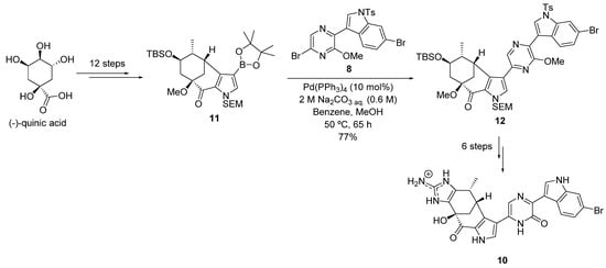 Another dragmacidin that has attracted attention because of its biological and pharmacological activities is Dragmacidin F 10, which has shown antiviral activity against the herpes virus and human immunodeficiency virus [38]. Stoltz et al. [39] developed a total synthesis for 10 starting from a single enantiomer of quinic acid (Scheme 5). In this total synthesis, a series of halogen-selective Suzuki cross-coupling reactions were used to synthesize the carbon skeleton of this marine alkaloid. First, the pyrroloboronic ester 11 underwent a halogen-selective Suzuki cross-coupling reaction with the previously shown fragment 8. In this step, authors took similar conditions used in the analog step on the synthesis of Dragmacidin D 1 (Scheme 5) [37] to obtain the desired product 12 with a 77% yield. Finally, compound 12 was transformed into Dragmacidin F 10 after six more steps.