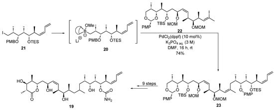 There are many total syntheses reported for Discodermolide 19, in which a Pd-catalyzed cross-coupling reaction is employed. Marshall et al. [44] proposed a total synthesis for Discodermolide, in which the last C-C bond-forming reaction required to synthesize the Discodermolide skeleton was a Suzuki coupling reaction between the trialkyl boronate 20, prepared in situ from iodide 21, and vinyl iodide 22 in the presence of PdCl2(dppf) (Scheme 7). Product 23 was therefore obtained with a yield of 74%. Nine additional steps afforded the desired natural product Discodermolide 19.