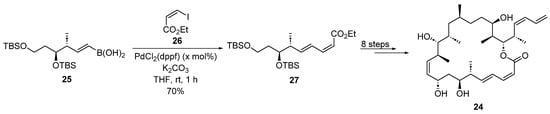 Dictyostatin 24 is a polyketide isolated in 1994 from a dark sponge of the genus Spongia [45]. This compound can be described as a substituted 22-membered macrolide with 11 stereocenters and a backbone of 26 carbon atoms. Its activity is similar to Discodermolide 19, and it has shown a low nanomolar cytotoxicity towards different human cancer cell lines [43]. Ramachandran et al. [46] reported in 2007 a total synthesis for this marine polyketide, in which the synthesis of one of its structural subunits included a Suzuki coupling reaction (Scheme 8). In this synthesis, the cross-coupling reaction catalyzed by PdCl2(dppf) between boronic acid 25 and (Z)-vinyl iodide 26 in THF produced the desired diene ester 27 in 70% yield. The natural product Dictyostatin 24 was finally obtained after eight extra steps.