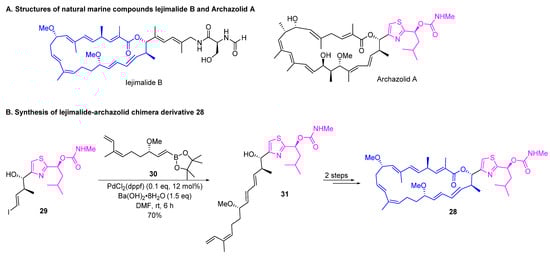 The similarities in structure and activity of these compounds motivated Fürstner et al. [49] to design and synthesize an Iejimalide–archazolid chimera 28 containing the macrolactone ring of Iejimalide B and the side chain of Archazolid A. In their approach, the side chain building block 29 reacted with boronate 30 under PdCl2(dppf) catalysis, via a Suzuki cross-coupling reaction. Product 31 was obtained with a yield of 70%, and two more steps provided the Iejimalide–archazolid chimera 28 (Scheme 9B).