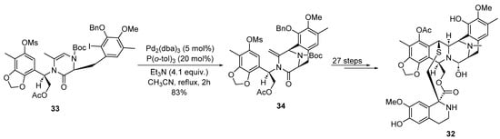 In 2002, Fukuyama et al. [55] reported a total synthesis of trabectedin, in which an intramolecular Heck reaction catalyzed by palladium was crucial for the synthesis of the bicyclo(3.3.1) system (Scheme 10). Thus, the cyclic enamide 33 was reacted under mild conditions in the presence of Pd2(dba)3 and P(o-tol)3 to give the tricycle 34 an 83% yield. The target marine drug could be synthesized by employing 27 additional steps.