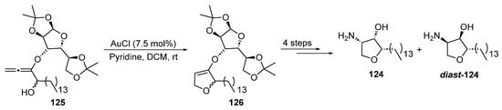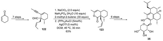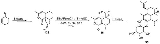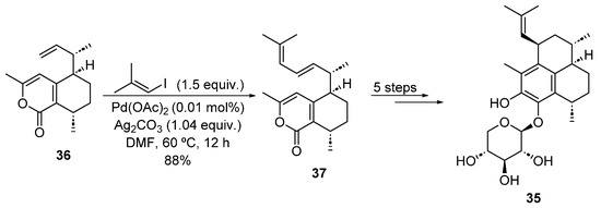Among these pseudopterosins, the Pseudopterosin A 35 is one of the most studied. It inhibits phagocytosis and activates calcium release, as well as reduces cellular bursts during cellular stress in unicellular protists [57]. Yu et al. [59] reported a synthetic route to this glycoside, in which one of the key steps consists of a regioselective Heck reaction (Scheme 11). Herein, the α-pyrone 36 was coupled with 1-iodo-2-methylprop-1-ene in the presence of the catalyst Pd(OAc)2 and the base Ag2CO3. The diene 37, obtained with an 88% yield and an E/Z ratio over 19:1, could be converted in the final Pseudopterosin A 35 after five additional steps.