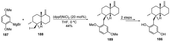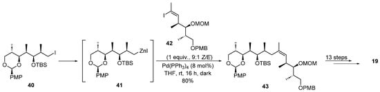 Similarly, Smith et al. [61] developed a synthetic route towards (+)-Discodermolide 19, in which one of the key fragments’ couplings was performed through a Pd-catalyzed Negishi reaction (Scheme 13). In this reaction, the organozinc species 41 was generated in situ from compound 40. Then, it reacted with vinyl iodide 42, using Et2O as a solvent and in the presence of Pd(PPh3)4 to produce the compound 43 with an 80% yield. Target compound (+)-Discodermolide 19 was isolated after 13 additional steps.