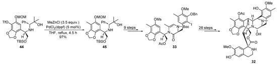In the Heck cross-coupling reaction section, the total synthesis of Trabectedin 32 by Fukuyama [55] was mentioned, in which one of the key steps was an intramolecular Heck reaction of 33 (Scheme 10). A Negishi reaction was also a key transformation used previously for the synthesis of one of the constituent fragments (Scheme 14). Thus, the methyl group present in the aromatic ring of 32 was introduced by the Pd-catalyzed cross-coupling reaction of 44 with methylzinc chloride, giving the product 45 with a 97% yield. Nine additional steps were required to obtain intermediate 33, which was then converted to the final product as explained before.