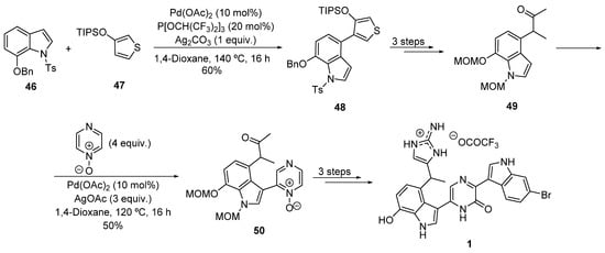 In previous sections, it has been exposed to Stoltz’s synthesis of Dragmacidin D 1 [37], where the key reactions were sequential Suzuki–Miyaura cross-coupling reactions (Scheme 4). This synthesis, while being effective, required a lot of steps, as both organometallic and organic halides coupled in the cross-coupling reactions required to be prior functionalized. When the C-H activation is considered, these prior steps are not needed, and in this line, Itami et al. [62] developed a total synthesis of Dragmacidin D 1, in which two of the key steps were metal-catalyzed C-H couplings (Scheme 15). First, the coupling of the indole 46 with 3-triisopropylsilyloxy-subtituted thiophene 47 was conducted using the catalytic system Pd(AcO)2/Ag2CO3/P(OCH(CF3)2)3 and 1,4-dioxane as a solvent, achieving the product 48 with yields of 60% and perfect regioselectivity. Then, the bis-MOM-protected indole 49 obtained from 48 after a few steps underwent a second C-H/C-H coupling reaction with pyrazine N-oxide, using in this case the catalytic system Pd(AcO)2/AgOAc. Product 50 was obtained with moderate yields but with perfect chemoselectivity and could be converted into the desired product after three steps.
